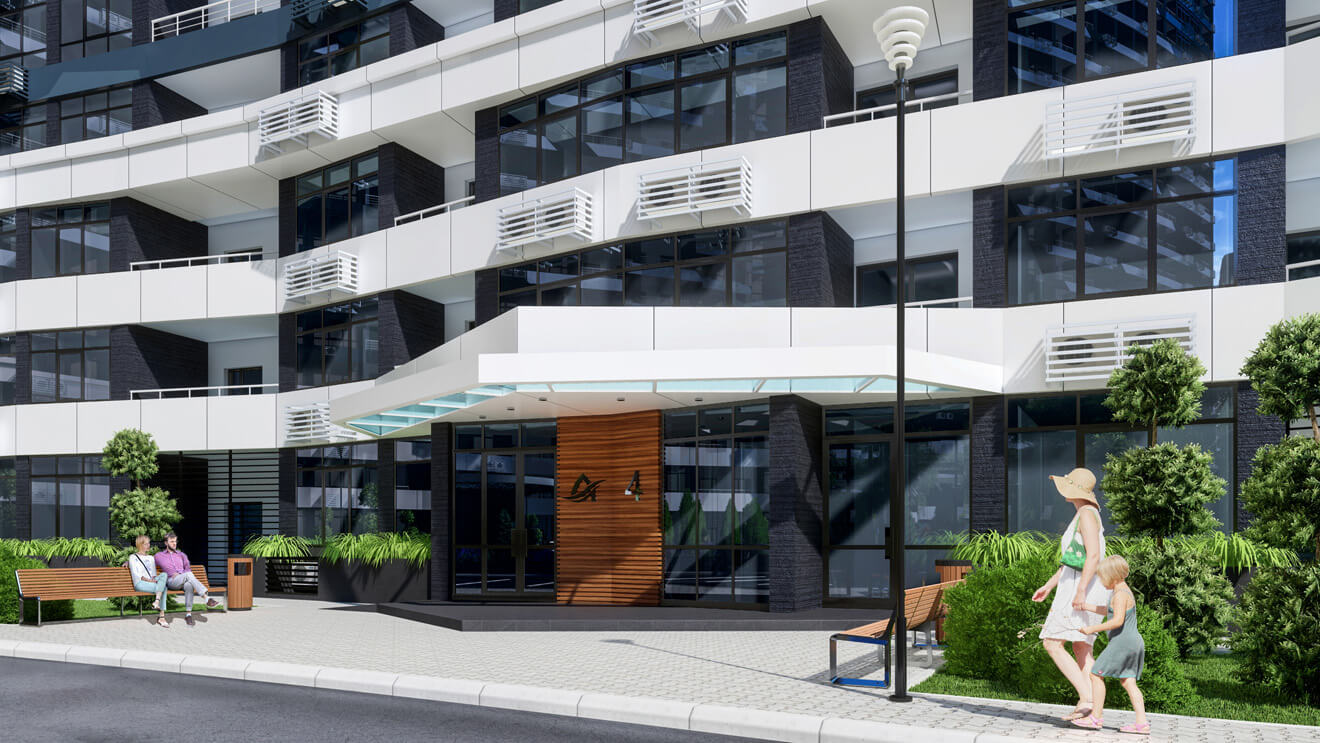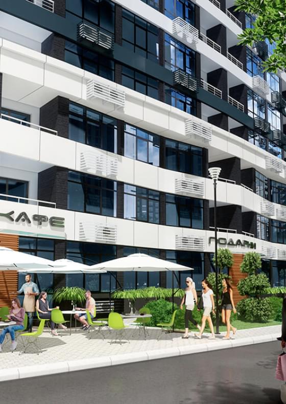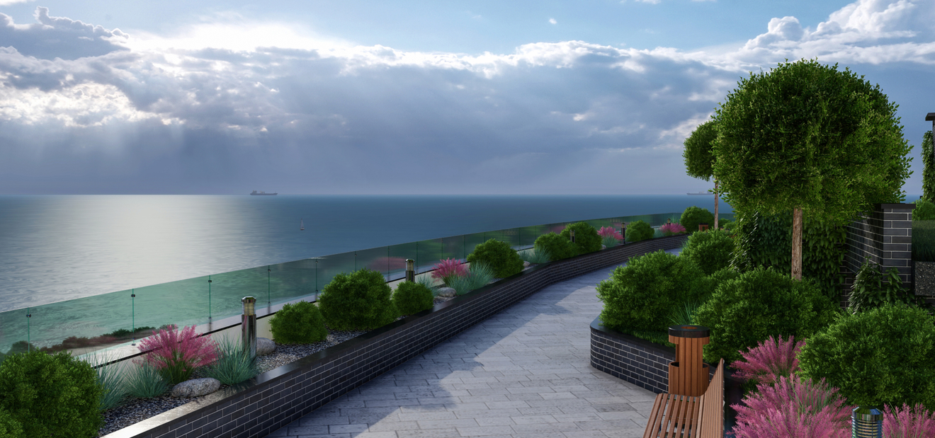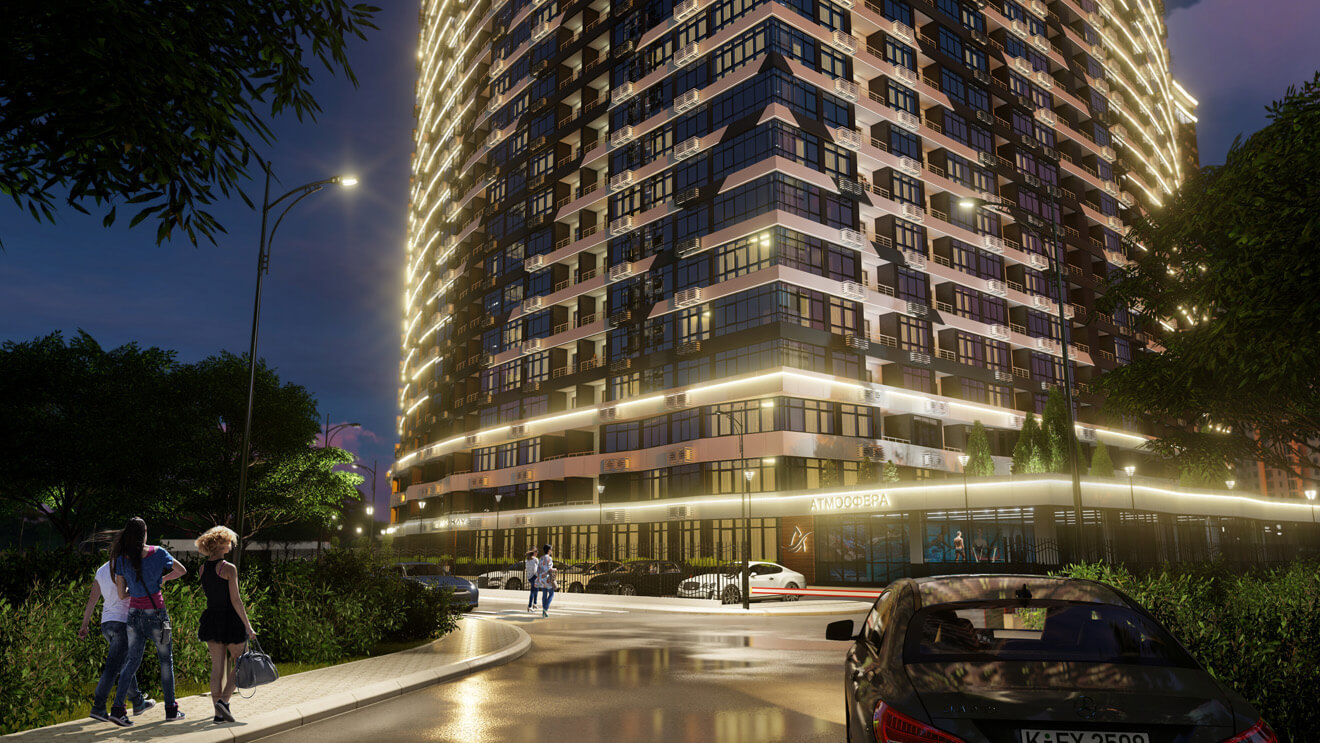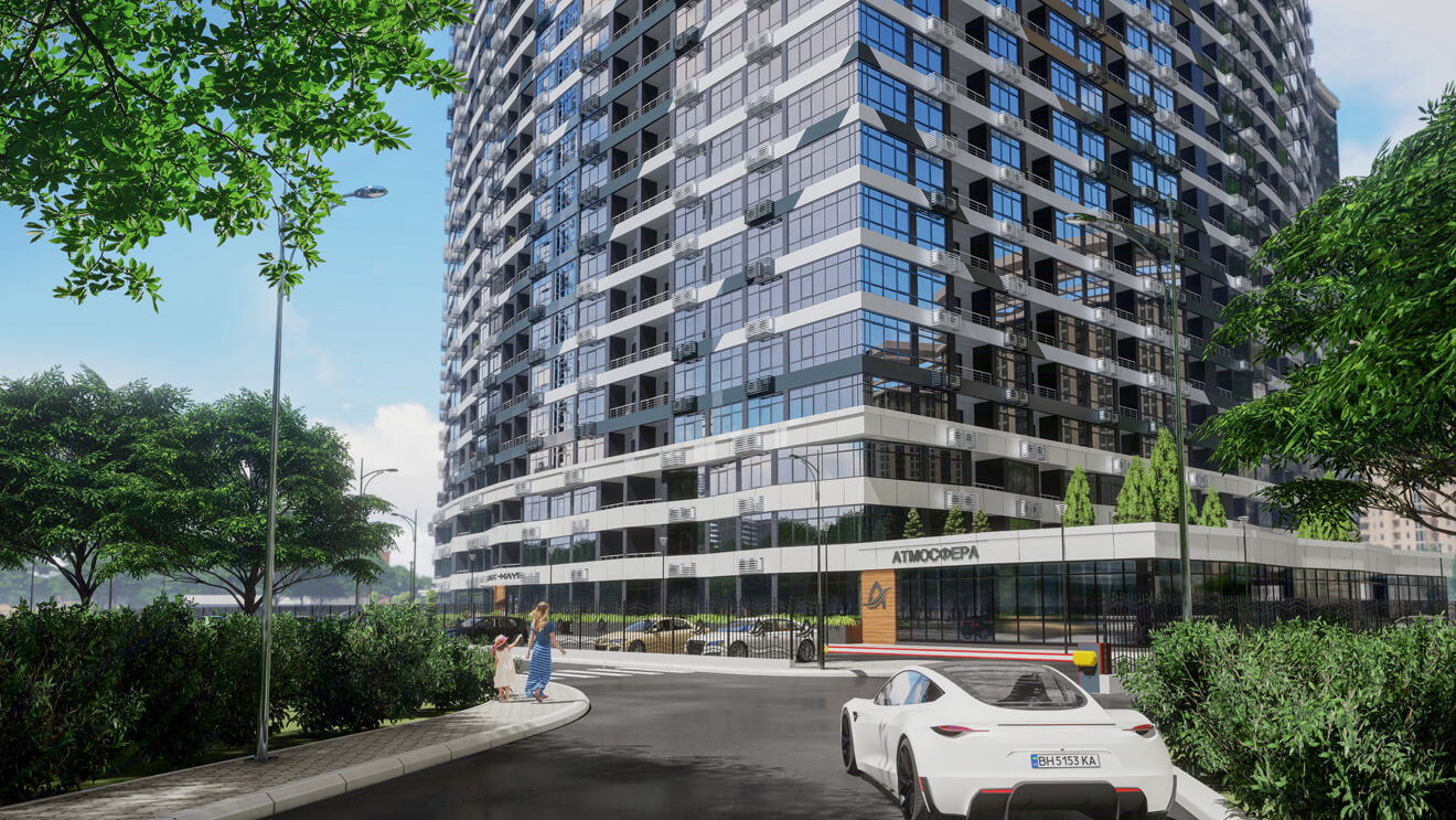 Архітектурне рішення проекту АТМОСФЕРА враховує прибережне розташування житлового комплексу. Фасад будівлі покликаний давати жителям оптимальну кількість сонячного світла і максимальне - свіжого морського повітря. А форма будинку ідеально створює локальний внутрішній двір. Вона нагадує океанський лайнер і відображає філософію проекту: ковзати по життю, як по морській поверхні.