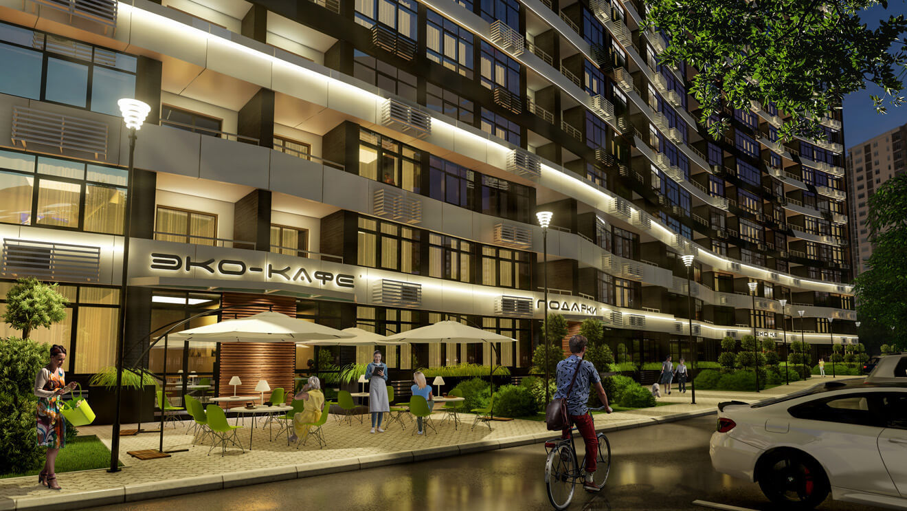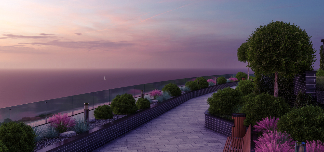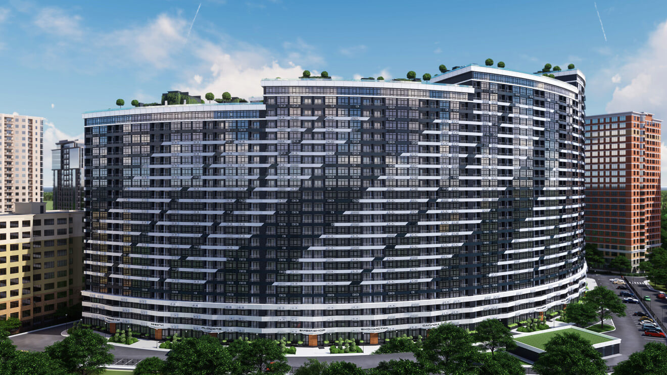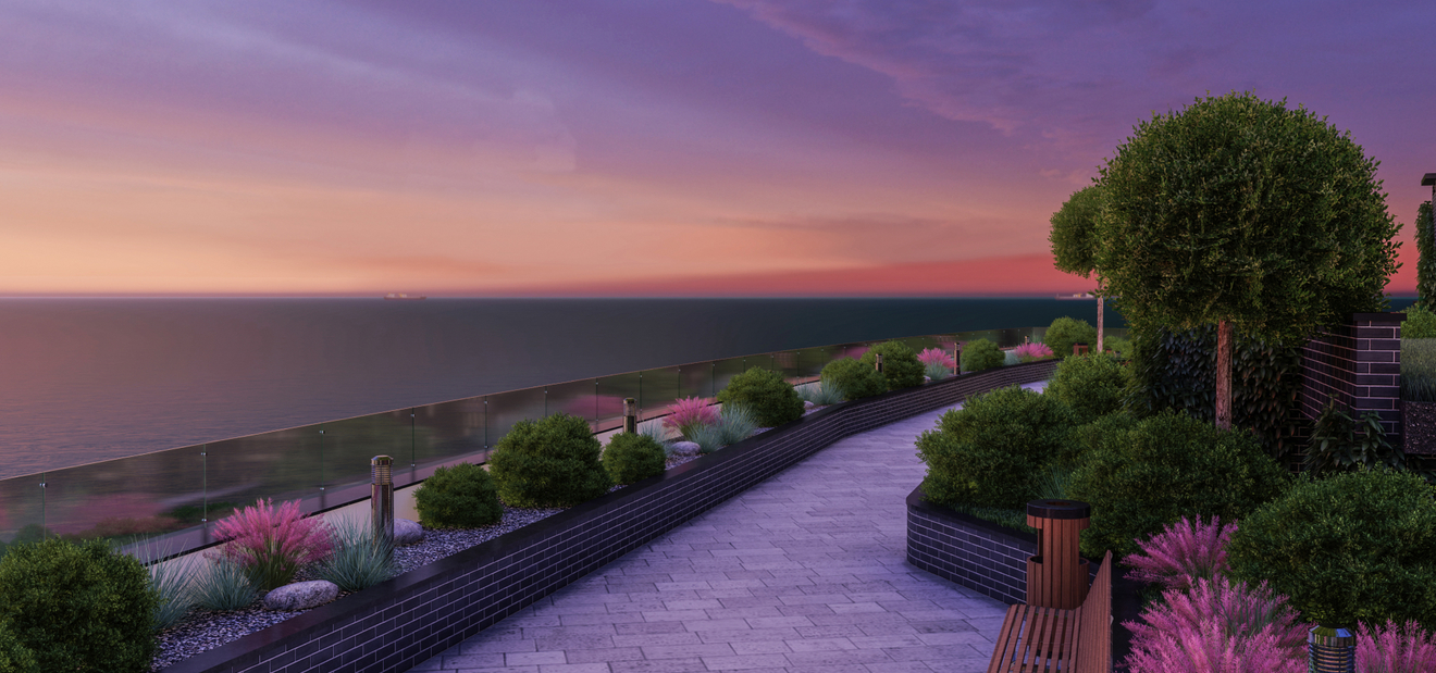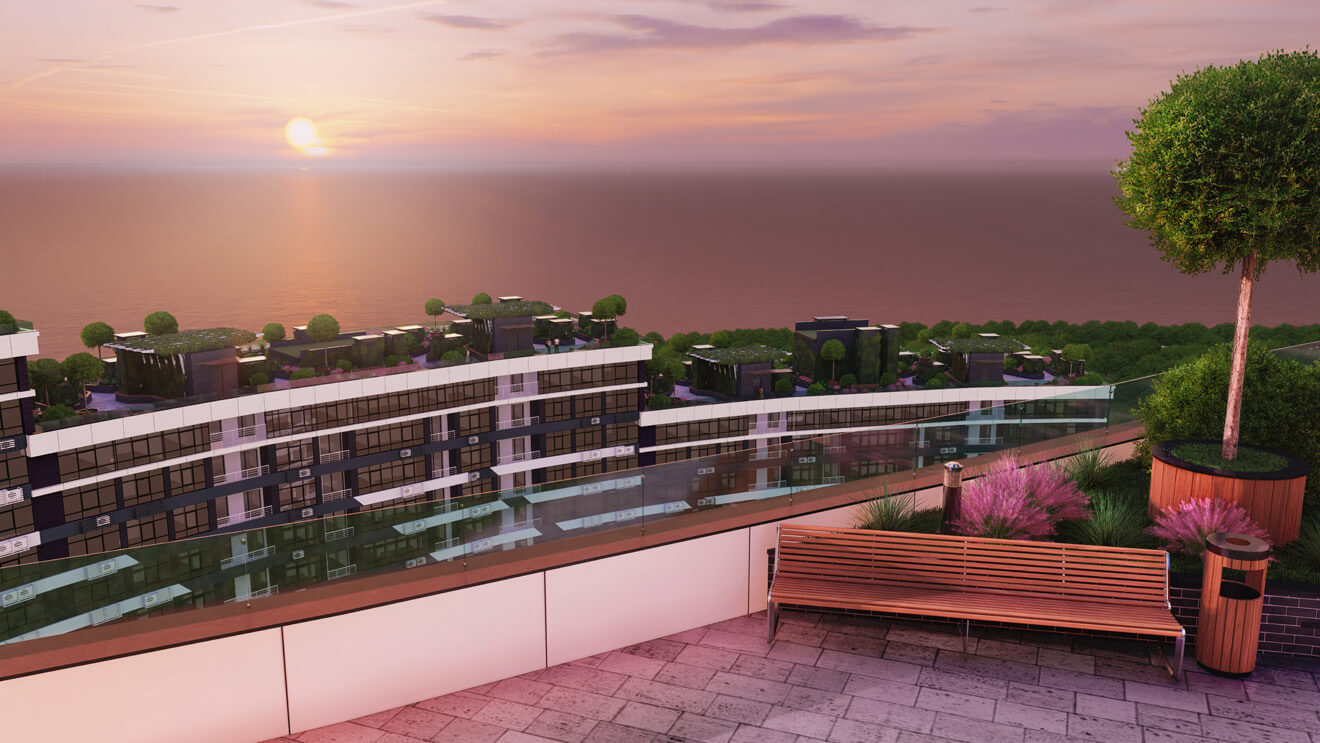 Архітектурне рішення проекту АТМОСФЕРА враховує прибережне розташування житлового комплексу. Фасад будівлі покликаний давати жителям оптимальну кількість сонячного світла і максимальне - свіжого морського повітря. А форма будинку ідеально створює локальний внутрішній двір. Вона нагадує океанський лайнер і відображає філософію проекту: ковзати по життю, як по морській поверхні.